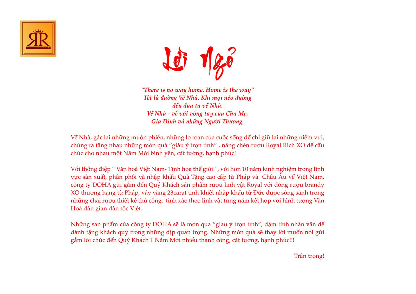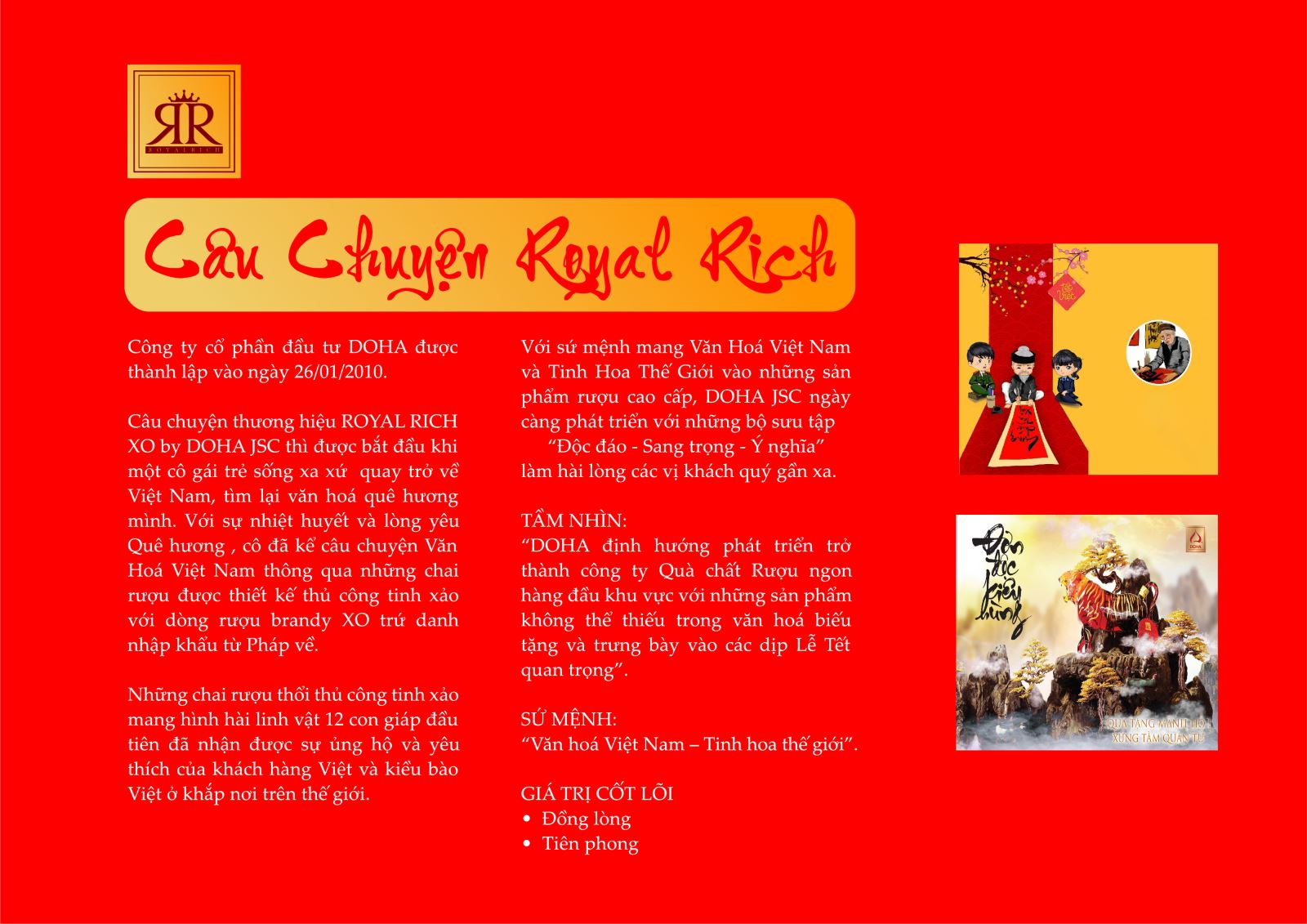 - Công ty Cổ phần đầu tư Doha ra mắt Catalogue với các sản phẩm quà tặng rượu linh vật mang nhiều thông điệp ý nghĩa trọn vẹn để đánh dấu những chặng đường với nhiều sự kiện trong một năm vừa qua và hân hoan cùng đón chào những sự kiện mới với nhiều thành công trong năm mới.