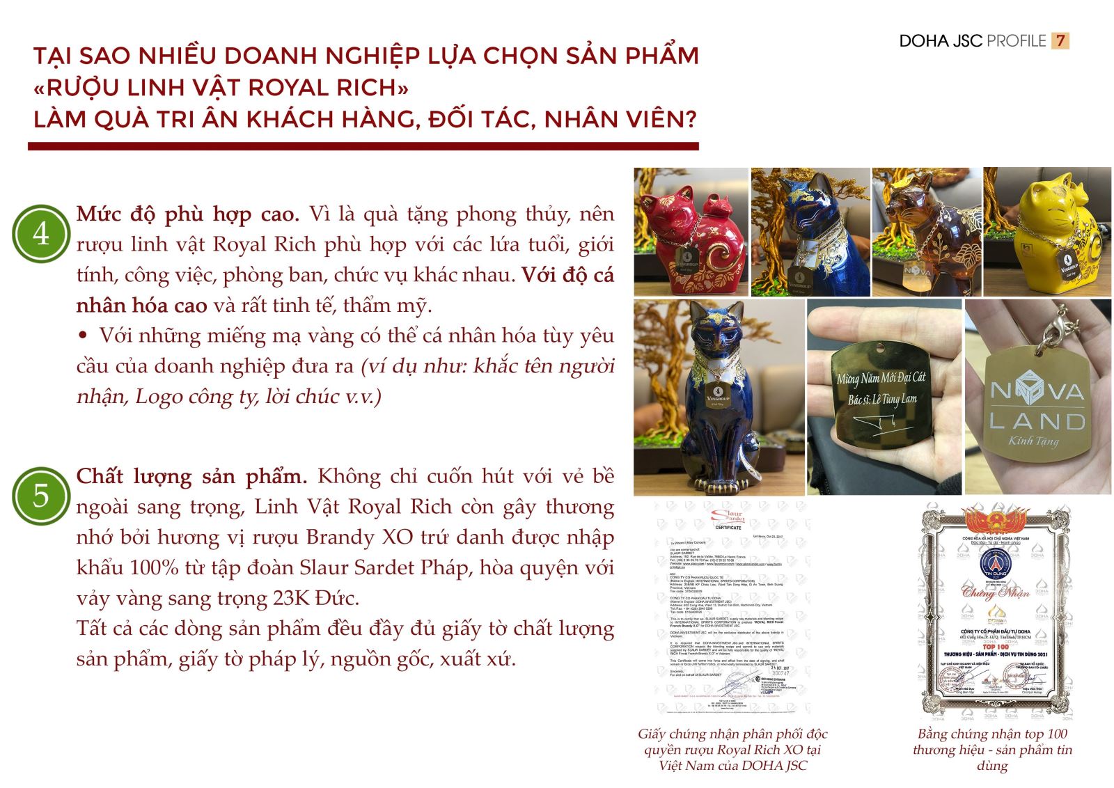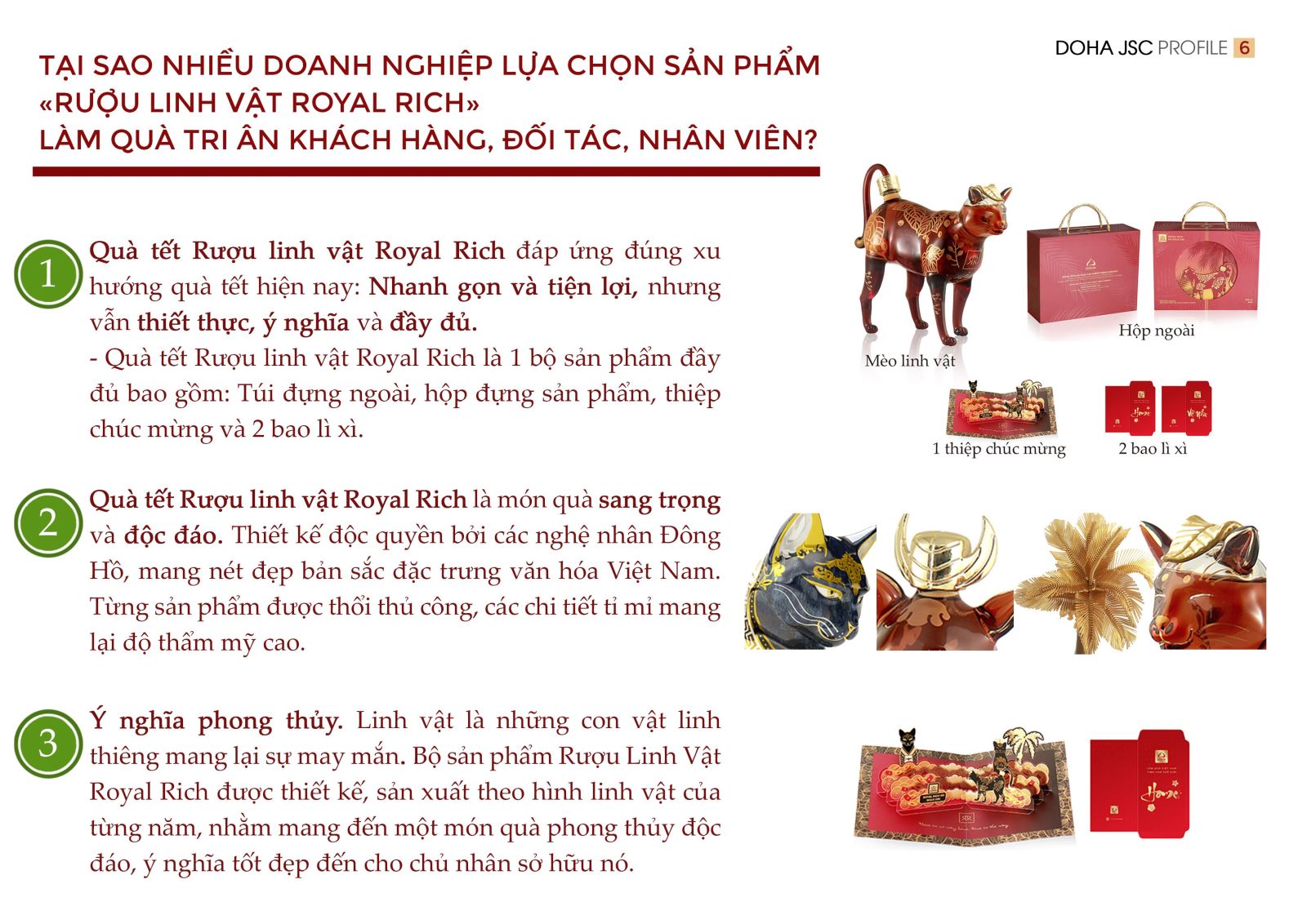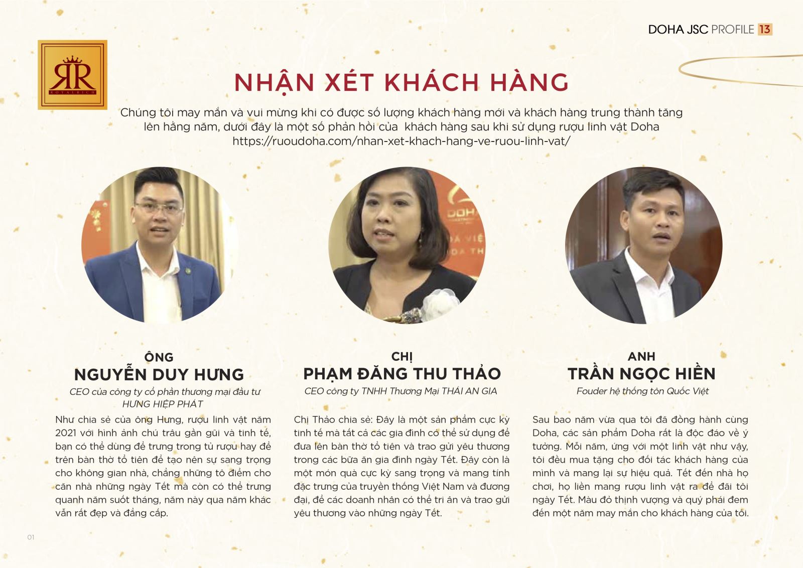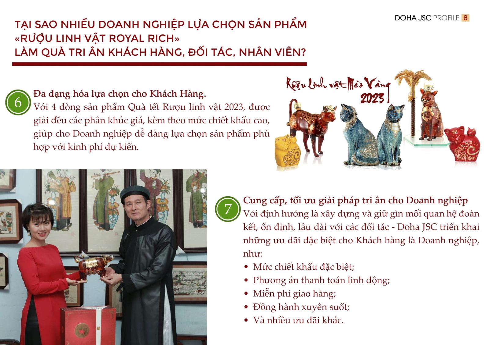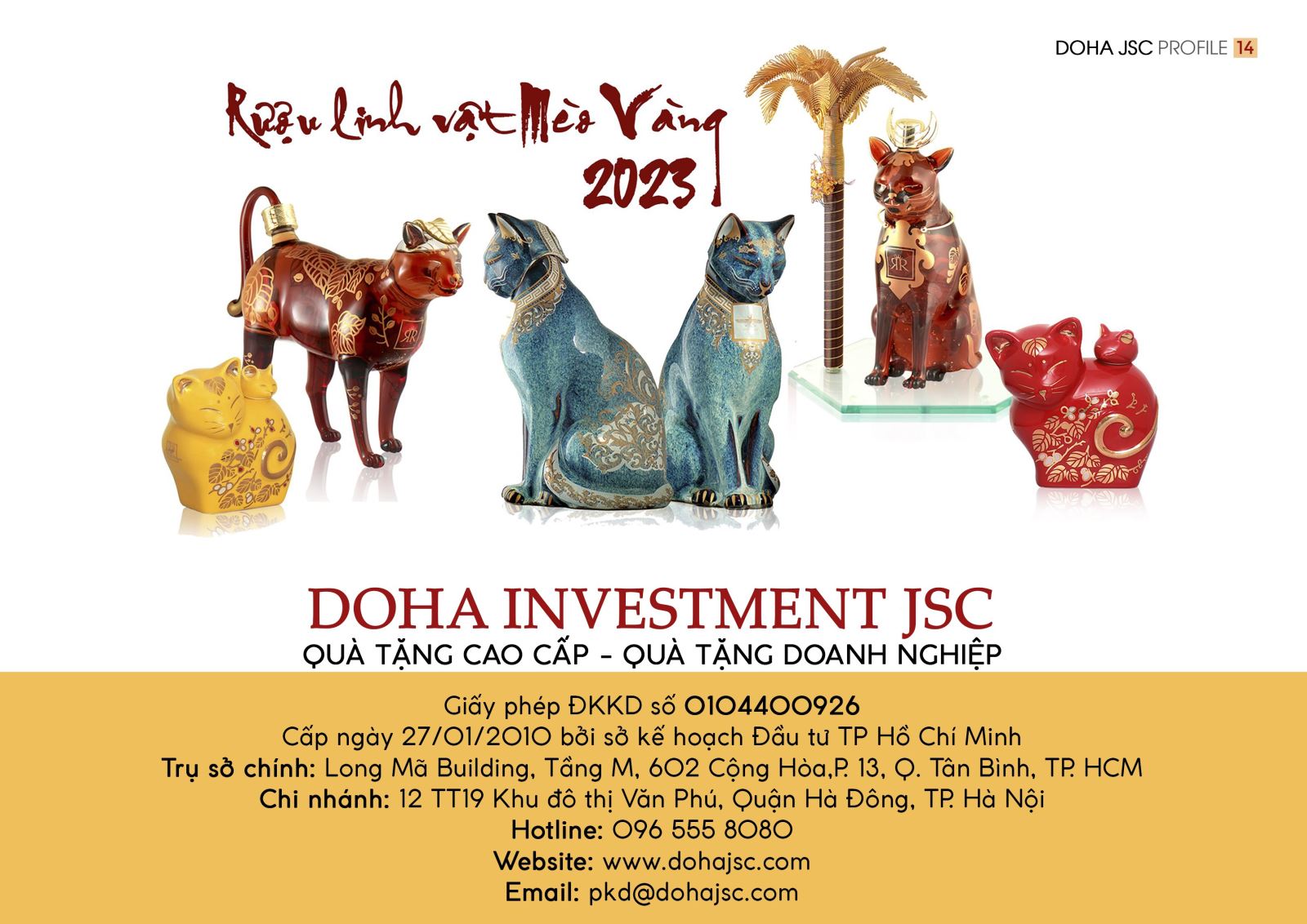- Công ty Cổ phần đầu tư Doha ra mắt Catalogue với các sản phẩm quà tặng rượu linh vật mang nhiều thông điệp ý nghĩa trọn vẹn để đánh dấu những chặng đường với nhiều sự kiện trong một năm vừa qua và hân hoan cùng đón chào những sự kiện mới với nhiều thành công trong năm mới.