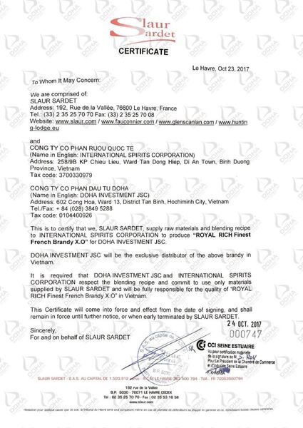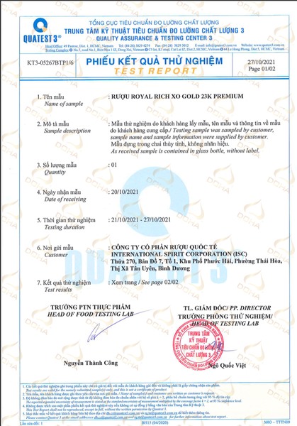 Phiếu kiểm nghiệm rượu Royal Rich XO Gold 23K Premium:
