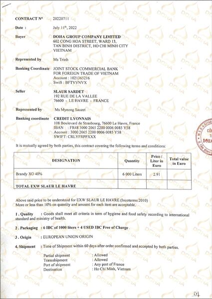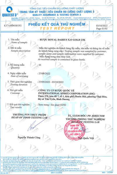 Phiếu kiểm nghiệm rượu Royal Darius XO Gold 23K: