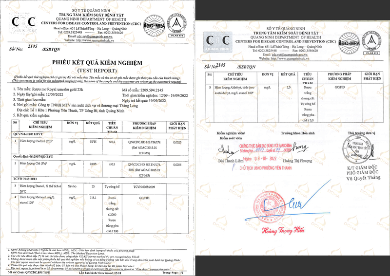 Phiếu kiểm nghiệm rượu Royal Umeshu Gold 23K: