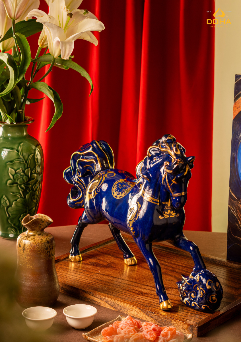 Tác phẩm sở hữu tạo hình mạnh mẽ và thanh thoát: dáng ngựa cưỡi mây hiên ngang, phủ men ngọc xanh dương huyền bí, dát vàng 23K lộng lẫy, biểu trưng cho khí chất lãnh đạo vận khí hanh thông.