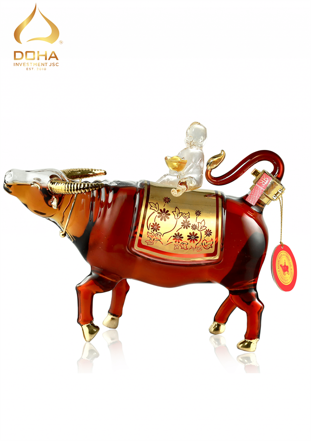 "Rượu Brandy XO Pháp: Trâu vàng đông hồ chứa rượu Brandy XO lừng danh thế giới từ tập đoàn Slaur. Rượu được ủ từ những trái nho tươi mọng nước, trải qua giai đoạn chưng cất phức tạp sau đó được ngâm ủ lên men trong thùng gỗ sồi lâu năm kỳ công. Hương vị cay nồng nhẹ nhàng hơn 6 năm tuổi, nồng độ 40% đủ làm người ta lâng lâng như khẽ chạm vào đôi môi ai kia làm tim rung động. Vảy vàng 23k từ Đức: mang biểu tượng của sự cao cấp, vảy vàng trong rượu trâu đông hồ được làm nên bởi kỹ thuật hiện đại tinh luyện vàng đến độ tinh khiết cao, tạo ra những tấm vàng mỏng gần như trong suốt bắt mắt. Vảy vàng vừa mang sự đẳng cấp vừa rất an toàn cho sức khỏe người dùng." Với chất rượu Brandy XO được nhập khẩu từ Pháp mang hương vị nhẹ nhàng ngọt dịu hoà với một chút vị chua từ mơ tươi lên men xen lẫn là mùi thơm nhẹ nhàng từ hoa quả đã làm nên một mỹ vị nhân gian, chất rượu tuyệt vời ấy còn được tô điểm bởi những vảy vàng 23k xuất xứ từ Đức đã làm tăng thêm sự tinh tế, sang trọng và quyến rũ. Thức uống dịu nhẹ này đã được che chở, bao bọc bởi một chú trâu chất phác, được DOHA lấy ý tưởng từ bức tranh Đông Hồ của nghệ nhân Nguyễn Hữu Quả. Tất cả đã tạo nên một bức tranh vô cùng hoàn mỹ, một sản phẩm vừa mang tính hiện đại nhưng vẫn mang nét đẹp của cội nguồn, dù đi đâu vẫn nhớ về văn hoá dân tộc Việt Nam. Đây có lẽ là một món quà rất ý nghĩa để chúng ta gửi tặng cho những người thân yêu, những bạn bè trân quý vào những ngày lễ cũng như vào mỗi dịp tết đến xuân về, RƯỢU LINH VẬT là một sản phẩm rất tinh tế, độc đáo, sang trọng ẩn sâu bên trong lại mang một tình cảm đặc biệt to lớn, sẽ thay bạn gửi trao yêu thương.